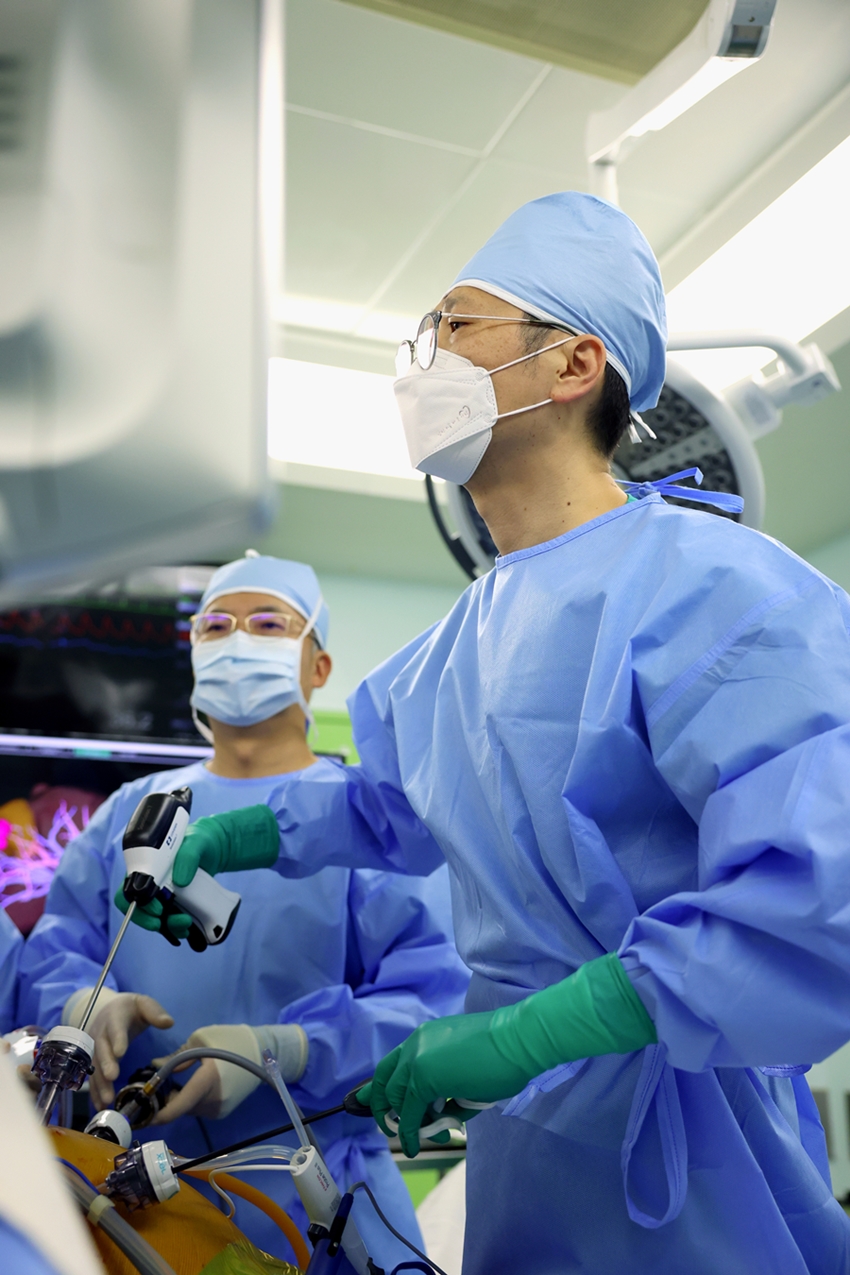 ▲서울아산병원 간이식·간담도외과 김지훈 교수(오른쪽)가 복강경 간 절제술을 집도하고 있다.